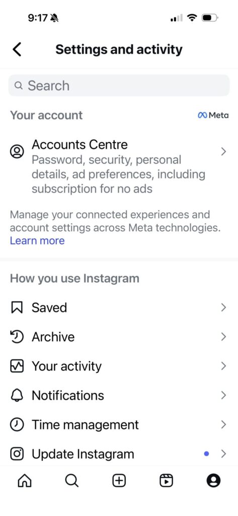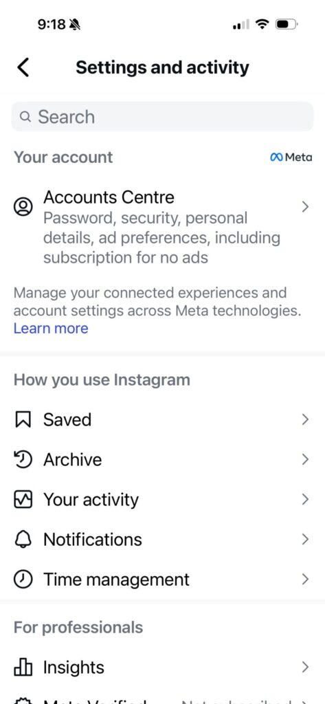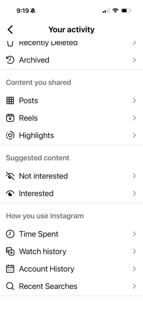 V How you use Instagram/Jak použváte Instagram jděte do Your activity/Vaše aktivita.