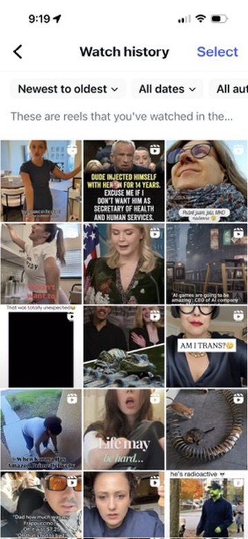 Zobrazí se vám přehled Reels až 30 dní zpátky. Můžete ho třidit, vybrat časové období a také filtrovat podle autora. Vpravo nahoře lze pomocí Select/Vybrat označit Reels, která pak lze z přehledu odstranit.